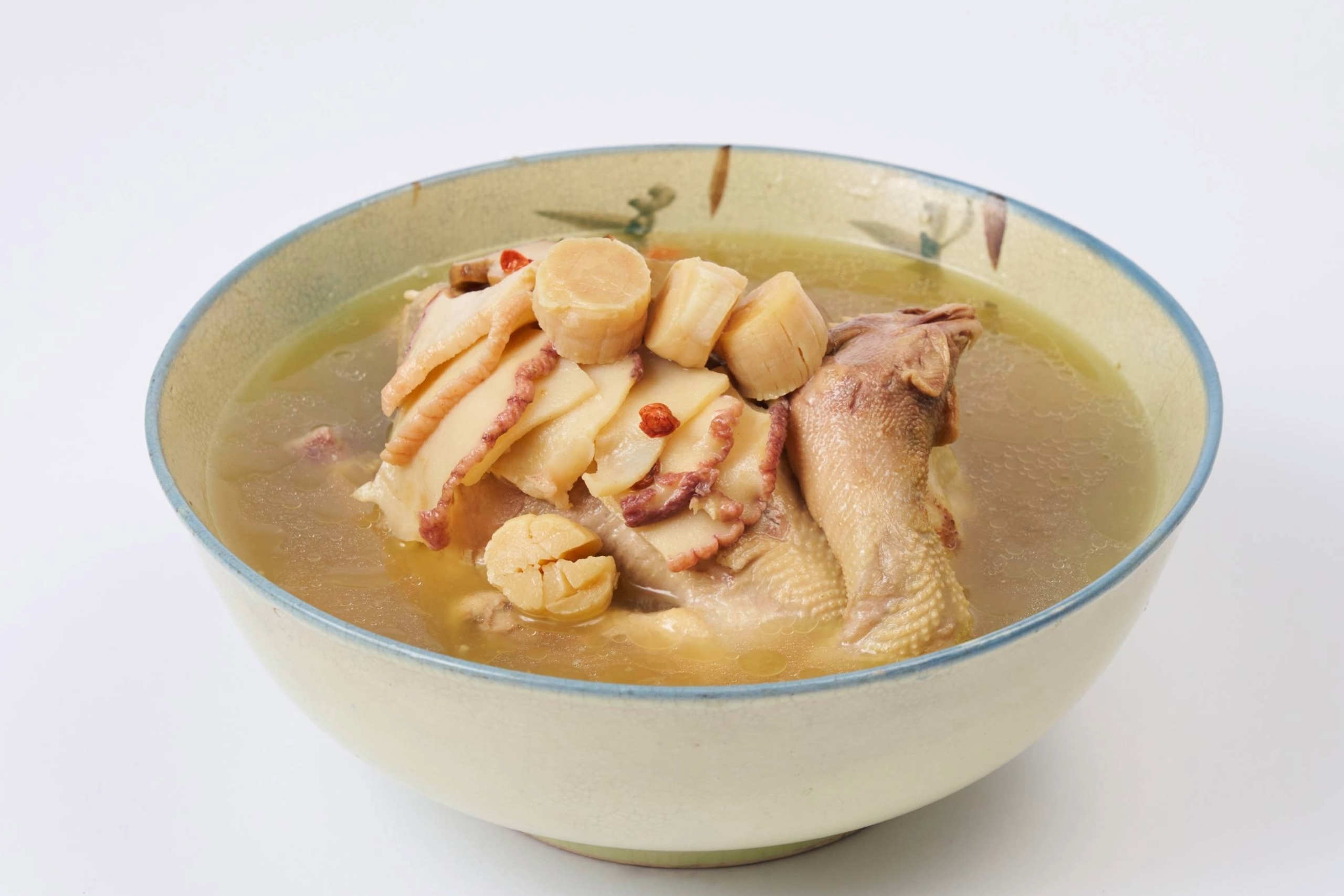 - 慢火細燉干貝松茸螺頭黃金雞湯
