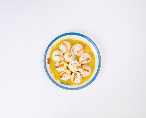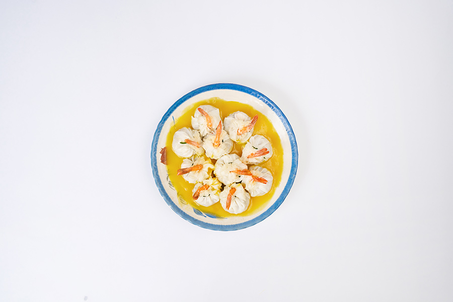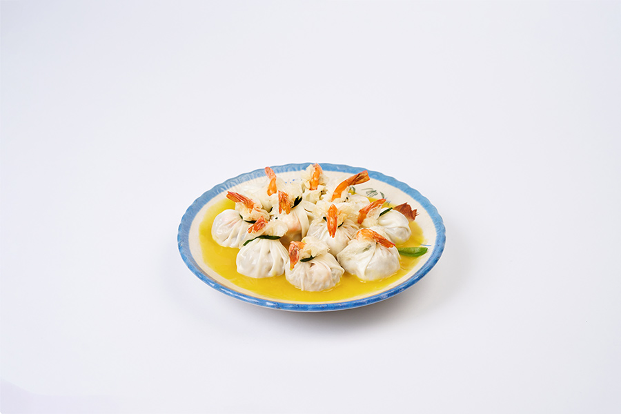 選用肥瘦相間的豬絞肉,加入去殼的鳳尾白蝦,與切碎的荸薺作成內餡,外層滿福袋用蛋白揉合麵粉包裹起來,鎖住鮮甜的滋味,再以台灣水蓮繫上裝飾。底層為南瓜、紅蘿蔔蒸熟成泥,帶有蔬菜天然的甜味,來襯托這道鳳尾金湯滿福袋的色澤與層次,輕鬆退冰稍蒸即可呈現這道手路菜。