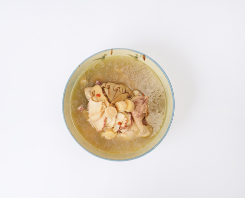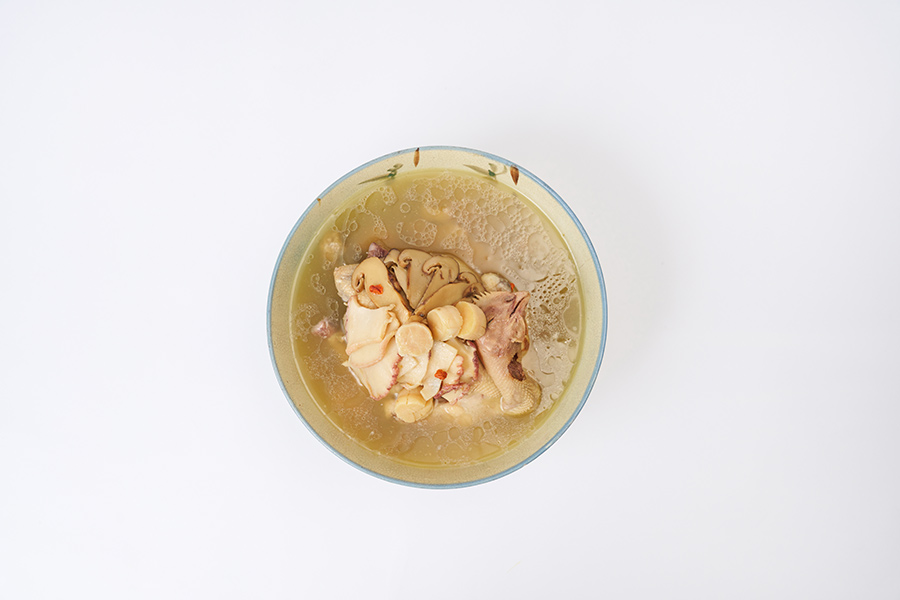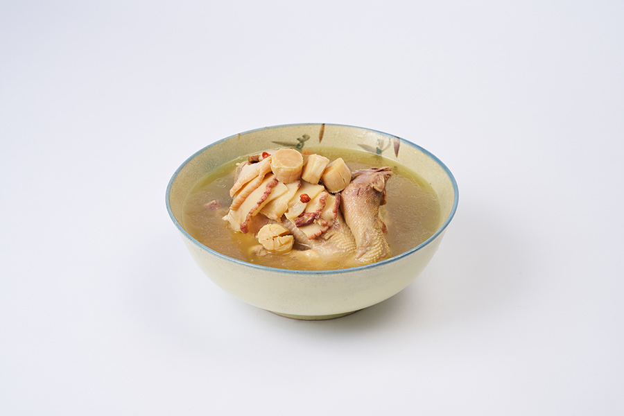 以堅持熬煮八小時以上的特色老母雞上湯,搭配安心認證的台東鹿野雞整隻,與干貝、螺頭、松茸等食材,來增添湯品鮮味繼續熬煮四小時,為全家人呈現暖胃養生的滋補湯品。